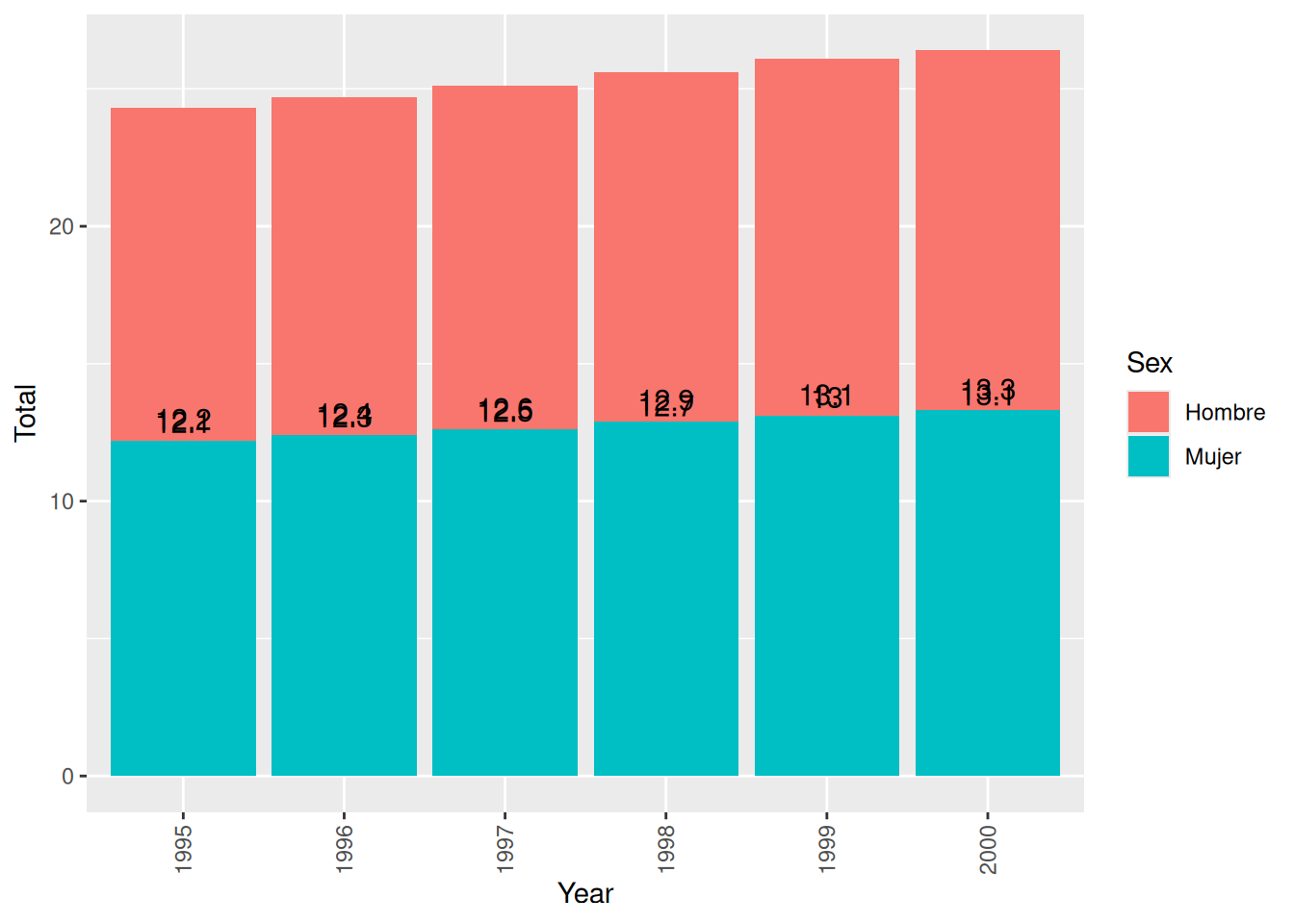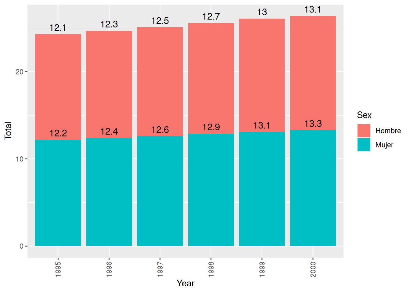 Por ejemplo, para la primera barra, que corresponde al año 1995, el valor para las mujeres es 12.2 y para los hombres es 12.1. La altura de la etiqueta para las mujeres coincidirá con el valor de su etiqueta (12.2). Sin embargo, para los hombres, la altura de su etiqueta será la suma de los valores de las etiquetas de los hombres y mujeres. Es decir 12.1 + 12.2 para el año de 1995.