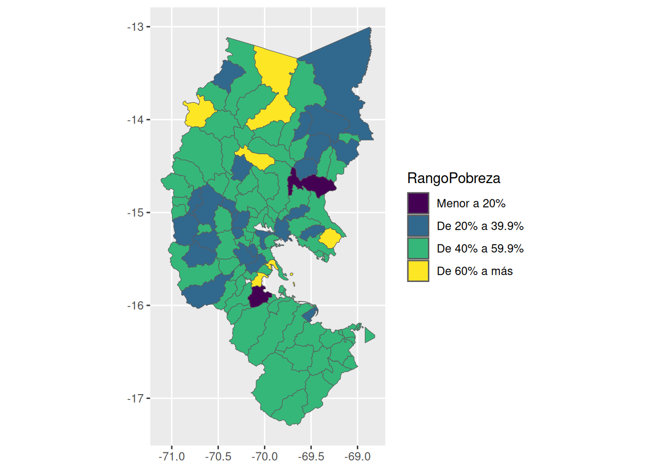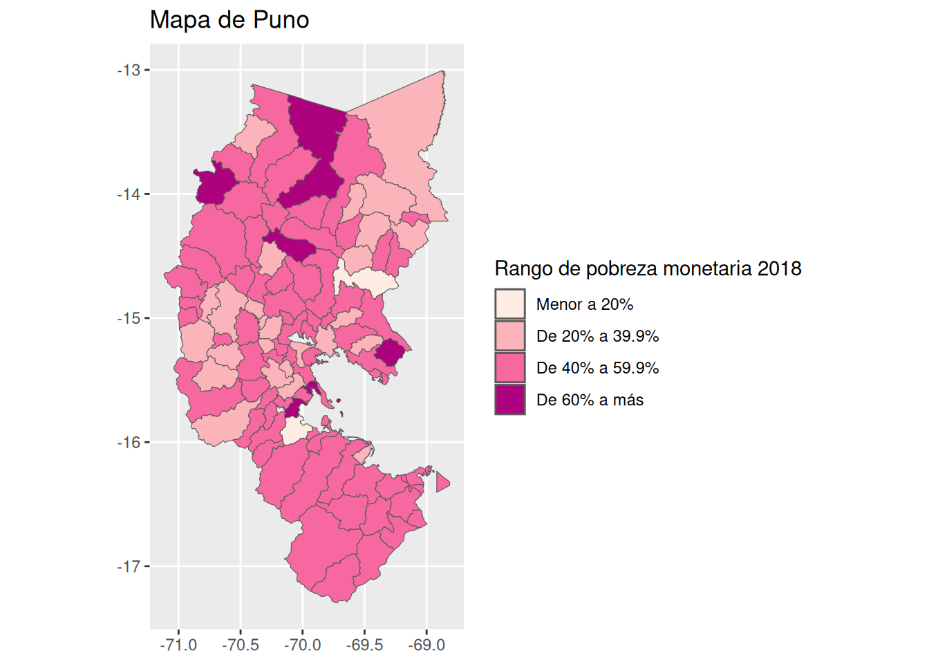 filter(REGION=="Puno")Ahora elaboramos el mapa temático con el paquete ggplot2. Nótese que estamos usando geom_sf y para ello fue necesario importar el paquete sf.