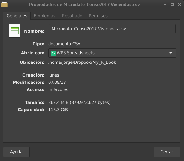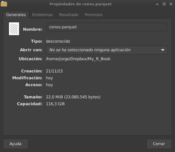 write_parquet(df, "censo.parquet")Podemos verificar que el archivo exportado a formato parquet pesa (en el disco duro) solo 22.0 MB. Es decir, menos del 10% del archivo original.